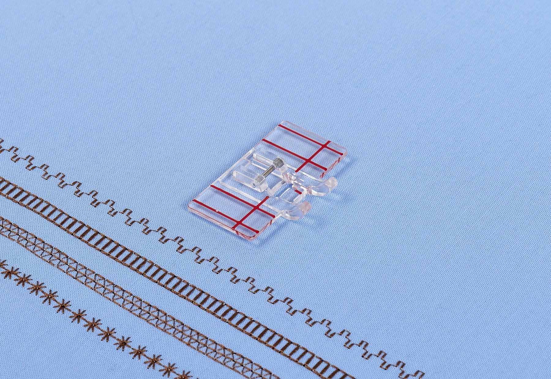 Easily match up your border designs with the red lines on the Border Guide Foot. You no longer need to mark every row beforehand!