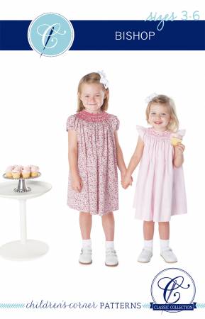 The Children's Corner Bishop 3 to 6 Years is the classic, raglan sleeved bishop with smocking around the neck. It falls just below the knee. The revised Bishop pattern inspired by the original Betsy, Gwen, and Ki Bishop patterns by Elizabeth Travis Johnson and includes 2 views that close in the back. View A has an easy self-faced placket with a seam up the center back. View B has a continuous bound placket and the back is cut on the fold. Choose from 4 different sleeves: banded puff, angel, long and short smocked sleeves.