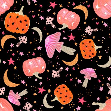 Ghostly Greetings Black Pumpkins & Mushrooms fabric—perfect for Halloween crafts. Durable high-quality material ideal for quilts costumes and festive décor. Unleash your spooky creativity!