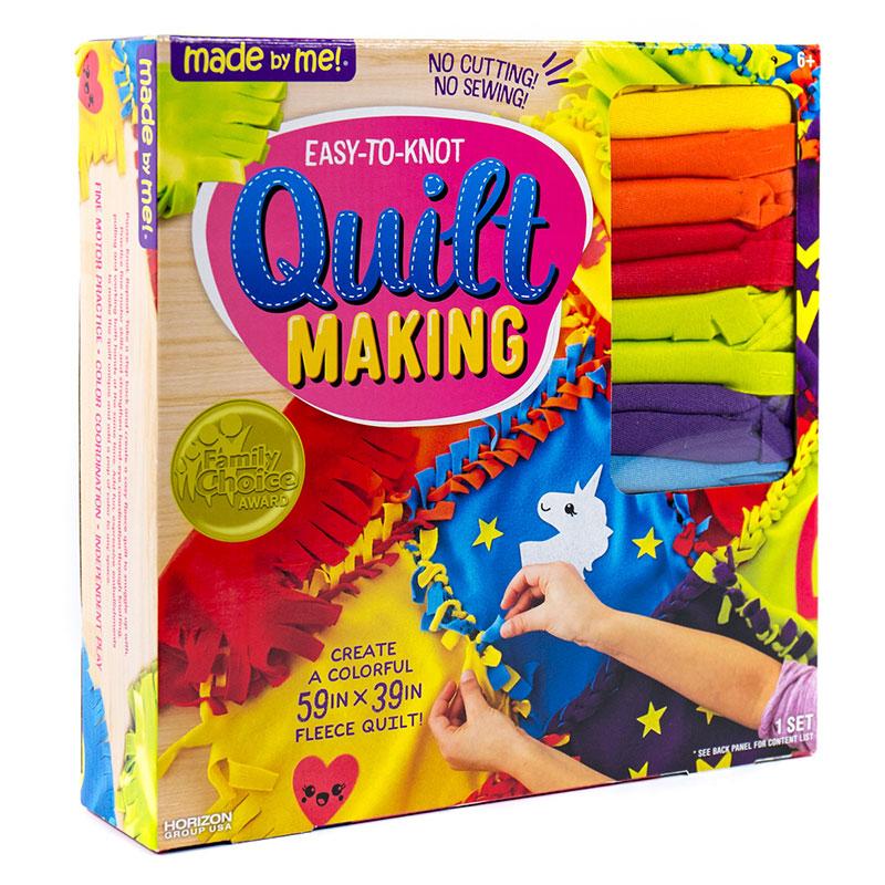 Create a colorful fleece quilt - 59" x 39" No Cutting! No Sewing! Learn 4 styles of knotting. Includes: 24-12" x 12" squares, 18 adhesive felt stickers to decorate your quilt and easy to follow instructions. For ages 6+
