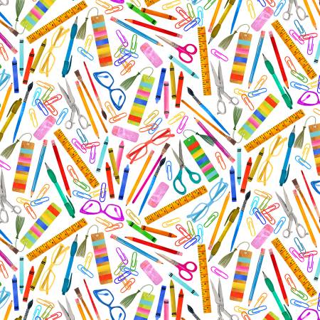 Transform your workspace into a vibrant haven with the "Books Are Magic || On My Desk || White" fabric by Michael Miller. Perfect for the creative soul, this fabric features a lively pattern of colorful stationery items like pencils, scissors, and rulers, set against a crisp white background. Whether you're crafting a unique desk accessory or a playful office decor piece, this fabric brings a splash of color and whimsy to any project. Made from high-quality materials, it ensures durability and a smooth finish. Ideal for those who love to express their personality through their workspace, this fabric is your canvas for endless creativity. Let your desk be a testament to your imaginative spirit!