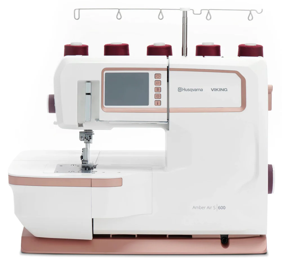 The Husqvarna Viking AMBER™ Air S | 600 is an advanced serger featuring revolutionary one-push air threading technology. This innovative machine makes threading the loopers incredibly easy—simply push a button and air pressure threads the loopers for you. Perfect for sewists who want professional serging results without the frustration of traditional threading.