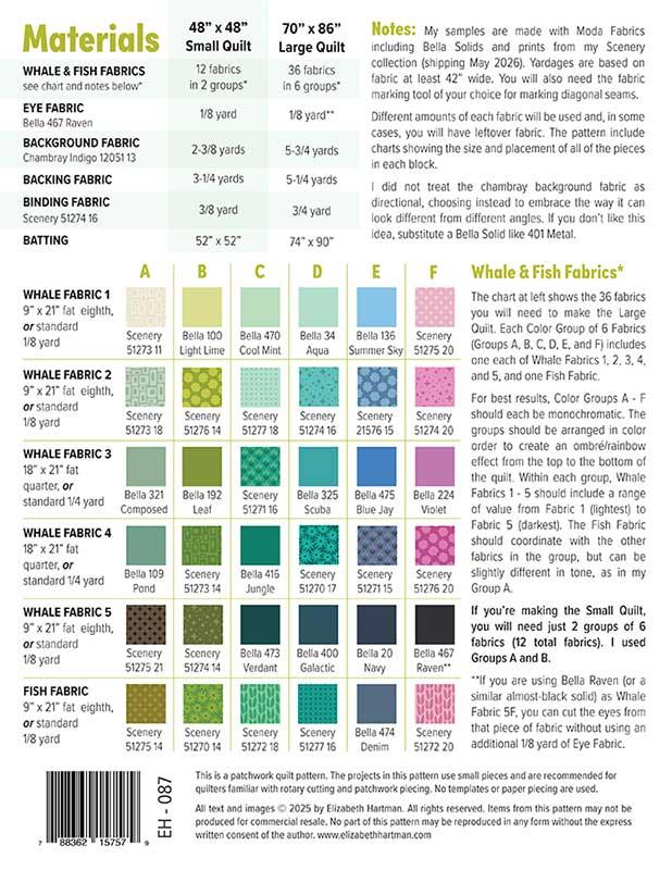 Dive into the delightful world of marine-inspired quilting with Whale Watching by Elizabeth Hartman. This charming quilt pattern captures the wonder of ocean life with beautifully detailed whale designs that bring movement and personality to any room. Available in two versatile sizes, it adapts perfectly to your project vision—whether you're creating a cozy throw or a statement-making bed quilt. Best of all, this pattern is fat quarter friendly, making it an economical choice that doesn't compromise on impact. Perfect for quilters of all skill levels, Whale Watching transforms simple fabric cuts into a stunning finished piece you'll treasure for years to come.